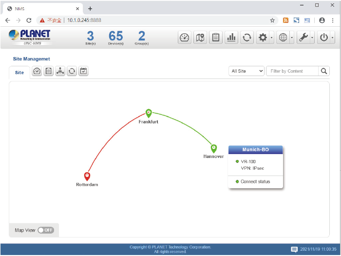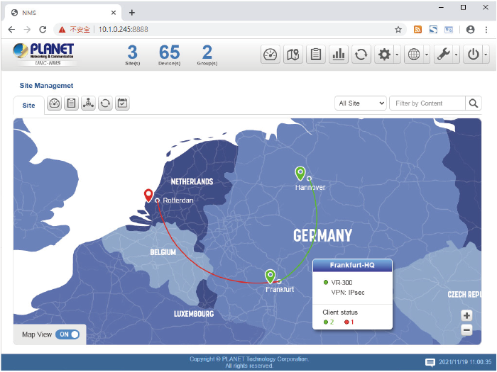 Con los mapas de sitios, cada sitio se puede ubicar de acuerdo con el mapa, lo que ayuda al administrador a obtener una vista general rápida del agente NMS y a ahorrar tiempo y costos de soporte y monitoreo en el sitio. Los estados actuales de los agentes NMS se muestran en tiempo real para optimizar el rendimiento de la red VPN de sitio a sitio. El controlador central NMS puede proporcionar hasta 100 sitios para todos los agentes NMS administrados.