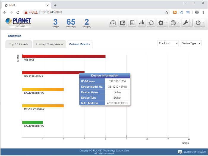 La página de estadísticas NMS enumera los 10 principales eventos de tráfico entrante y saliente, el estado de PoE y los eventos críticos. Puede ayudar al administrador a analizar qué dispositivo tiene un consumo de energía anormal, una temperatura anormalmente alta, un tiempo de uso ilegal y el final cercano del ciclo de vida para evitar un colapso de la red.