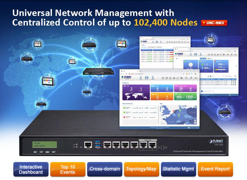 Los controladores centrales de gestión de red UNC-NMS de PLANET pueden supervisar directamente 102.400 nodos mediante la supervisión de NMS-500 o NMS-1000V en hasta 100 sitios. Sin embargo, los dispositivos implementados, como conmutadores gestionados, convertidores de medios, enrutadores, puntos de acceso inteligentes, teléfonos VoIP, cámaras IP, etc., deben cumplir con el protocolo MQTT, el protocolo SNMP, el protocolo ONVIF y la utilidad PLANET Smart Discovery. Estos permiten al administrador gestionar de forma centralizada estos nodos desde una oficina central, lo que aumenta enormemente la eficiencia de la gestión de la red y la energía.