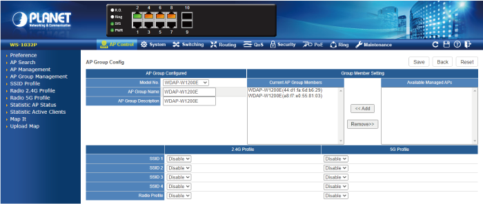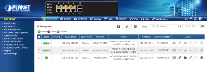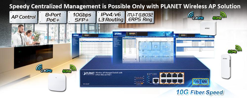 El WS-1032P ofrece una interfaz gráfica de usuario web fácil de usar para una configuración sencilla. Cuenta con una gestión centralizada de la serie PLANET Smart AP sin necesidad de configurar manualmente cada AP para el SSID inalámbrico, la banda de radio y la configuración de seguridad. Con un proceso de configuración de cuatro pasos, se pueden enviar simultáneamente diferentes propósitos de escaneo de perfil inalámbrico a múltiples AP o grupos de AP para minimizar el tiempo, el esfuerzo y el costo de implementación.