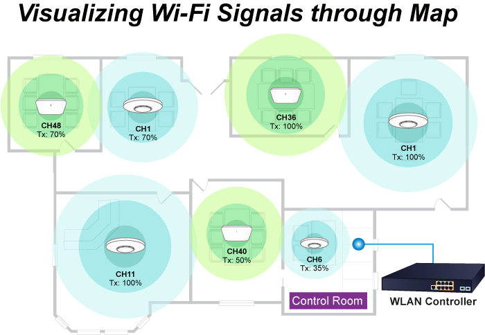 Importar sus mapas de piso y ubicar cada AP o grupo de AP según la implementación en el campo puede ahorrarle tiempo y costos de soporte y monitoreo en el sitio. Muestra el estado del punto de acceso en tiempo real y su mapa de calor de señal es capaz de reflejar la cobertura real y ayuda al administrador a ajustar la superposición de los puntos de acceso adyacentes en cualquier momento para optimizar el rendimiento de la red inalámbrica.