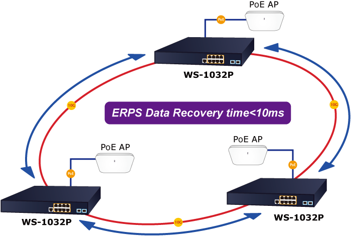 El WS-1032P admite la tecnología de anillo redundante y cuenta con una capacidad de autorrecuperación rápida y sólida para evitar interrupciones e intrusiones externas. Incorpora la tecnología avanzada ITU-T G.8032 ERPS (Ethernet Ring Protection Switching) y el protocolo Spanning Tree (802.1w RSTP) en la red del cliente para mejorar la confiabilidad del sistema y el tiempo de funcionamiento en entornos hostiles. En una determinada red de anillo simple, el tiempo de recuperación podría ser inferior a 10 ms para restablecer rápidamente la red, lo que permite que la red de administración siga funcionando.