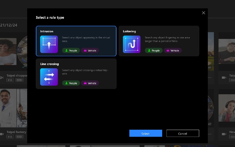 La búsqueda de escena permite a los usuarios buscar imágenes de video de una cámara específica mediante detección de cruce de línea, detección de intrusión o detección de merodeo.