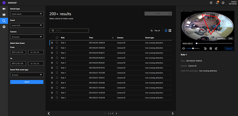 El ND9542P es compatible con la administración de alarmas y la búsqueda de eventos con la tecnología Deep Learning de VIVOTEK y Smart VCA. El usuario puede buscar por uno o varios tipos de eventos, reproducir eventos de alarmas y también exportar los videos de la búsqueda.