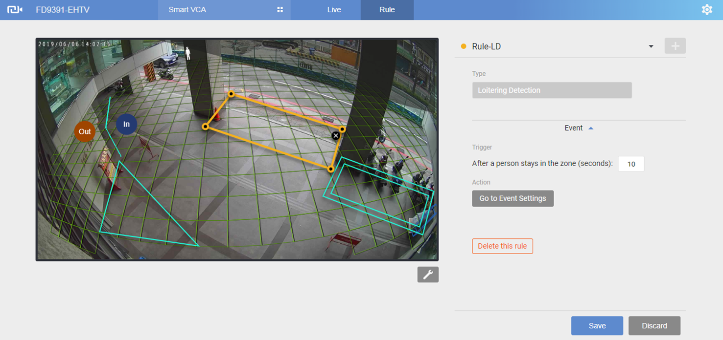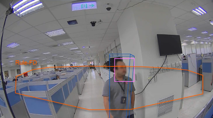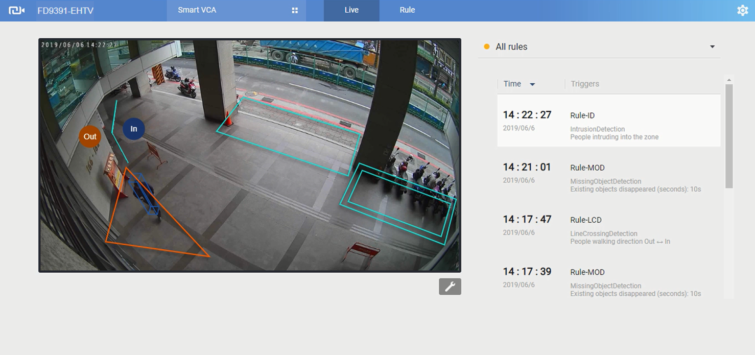 Por encima del núcleo de IA, se proporcionan múltiples reglas de eventos para detectar intrusión, personas merodeando o corriendo en una zona o cruzando una línea, objetos perdidos y abandonados, o para detectar rostros de una multitud dentro de la zona. Estas reglas cubren la mayoría de los requisitos típicos de aplicaciones de seguridad, y múltiples reglas pueden aplicarse a una sola vista de cámara.