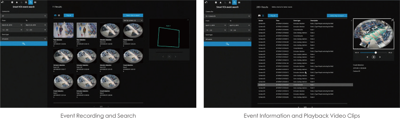 Compatible con la administración de alarmas y la búsqueda de eventos con la tecnología deep-learning de VIVOTEK, Smart VCA. Las reglas e información de VCA, como el seguimiento de personas y la detección de movimiento, se pueden mostrar tanto en video en vivo, como en reproducción en el monitor del NVR. El usuario puede buscar por uno o varios tipos de eventos, reproducir eventos de alarmas y también exportar los videos de la busqueda.