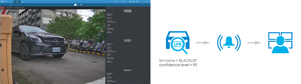 El VAST2 puede vincular la información de la placa con la transmisión en vivo y grabaciones a través de la integración con las cámaras de reconocimiento de placas de VIVOTEK (tales como IB9385-LPR e IB9387-LPR). Los usuarios pueden buscar y analizar los datos históricos y mostrar el número de datos de placas reconocidas en gráficos de líneas, exportar los resultados de búsqueda o mostrar los datos en el video en vivo desde las cámaras activadas por eventos de alarma cuando la información de la placa coincide con los criterios de alarma preestablecidos.