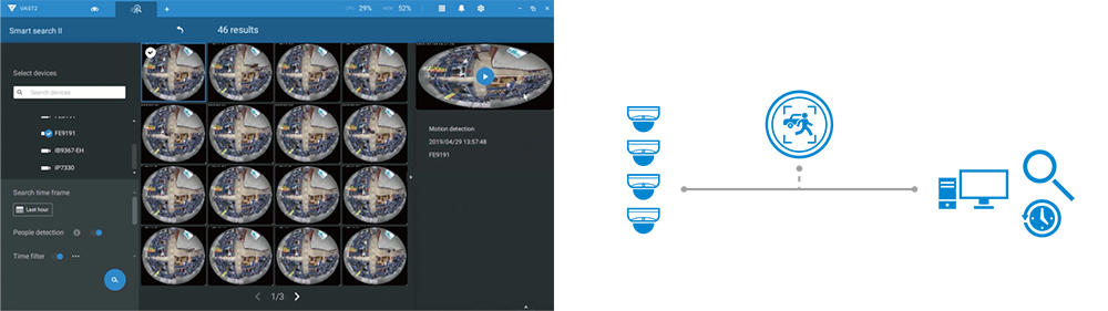 Permite a los usuarios buscar objetos o videos relacionados con personas de acuerdo con los metadatos del VCA (Análisis de contenido de video) de los videos de la cámara. Permite clasificar rápidamente grandes cantidades de evidencias para encontrar con precisión lo que se necesita.