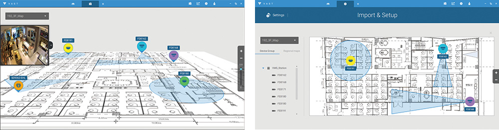 Las múltiples capas y las vistas FOV de la cámara permiten a los usuarios identificar instantáneamente una cámara seleccionada y su ubicación en el mapa.