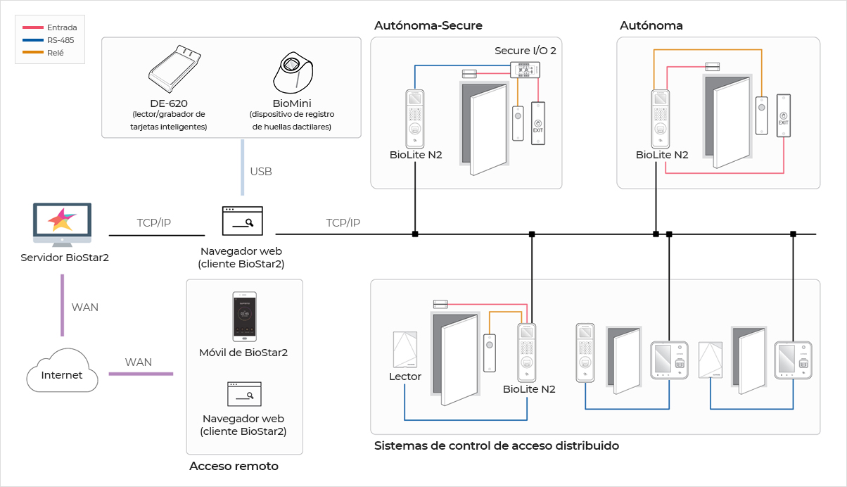 BioLite N2 no solo viene con una interfaz TCP/IP, sino también con interfaces más tradicionales (RS-485, Wiegand) para proporcionar mayor flexibilidad y múltiples opciones de instalación para diferentes entornos. También ofrece 2 entradas internas y 1 salida de relé interna para el control de dispositivos periféricos. Los puertos de E/S pueden expandirse con el accesorio Secure I/O.