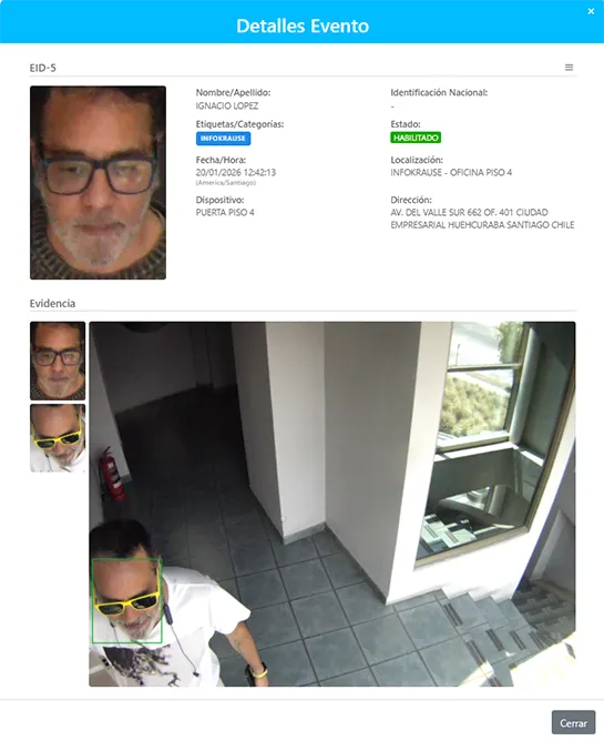 En esta sección podrá monitorear los eventos de reconocimiento facial en tiempo real que ocurren por localizaciones y dispositivos.